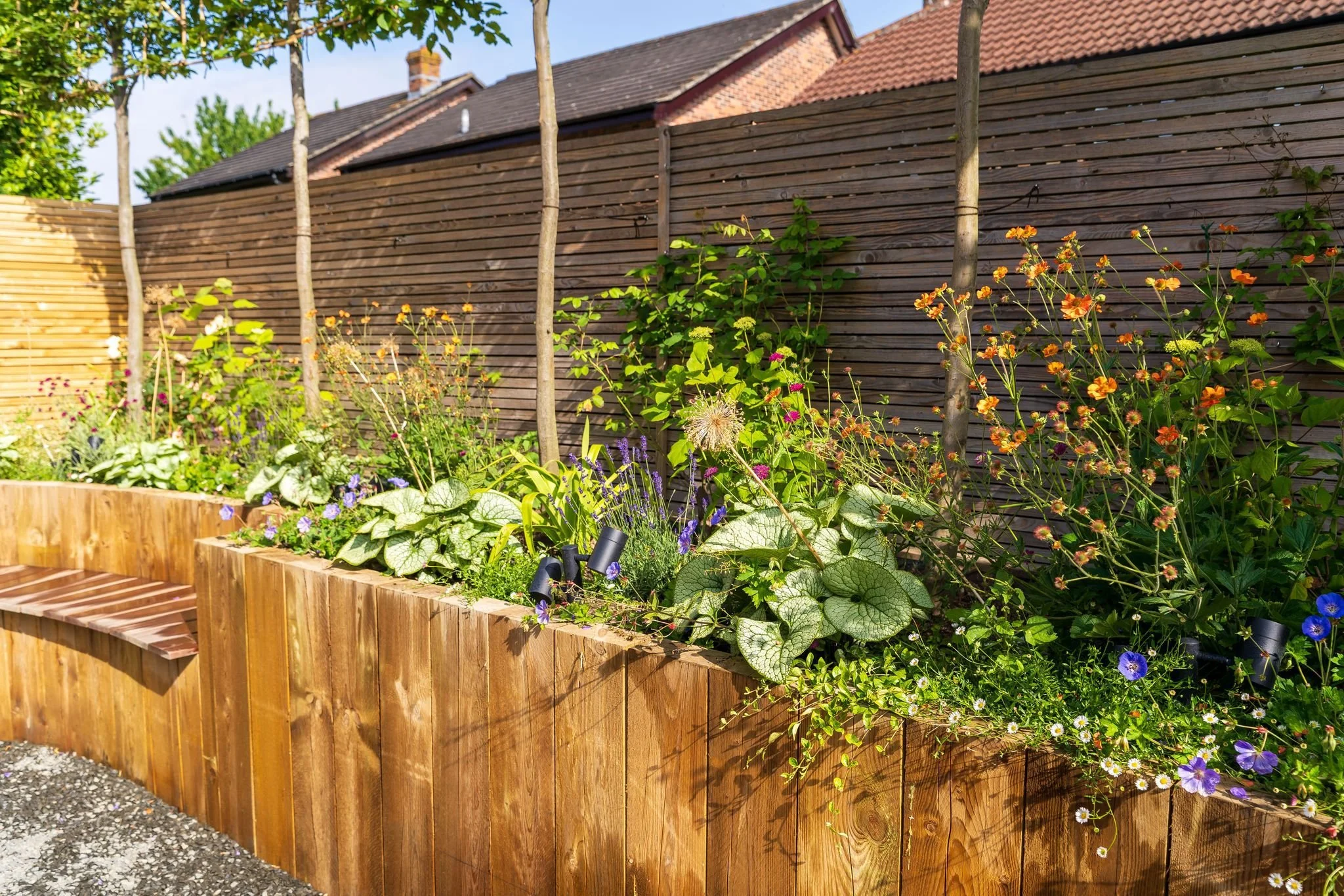 Generous terracing provides ample room for soft seating and space to unwind, creating a seamless flow between cooking, dining, and relaxing areas. The design is brought together with a carefully considered planting scheme that softens the contemporary structure, alongside pleached trees that offer privacy by screening neighbouring gardens.